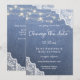 Les choses changent. Envoyez à vos invités une belle carte de changement de date de mariage avec ce modèle en jean & dentelle avec guirlande lumineuse. Parfait pour les mariages rustiques et en plein air.