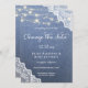 Les choses changent. Envoyez à vos invités une belle annonce de changement de date de mariage en raison de cette invitation en jean et dentelle avec guirlande lumineuse. Parfait pour les mariages champêtres et en plein air.