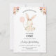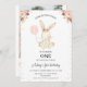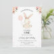 Moderne Pink Floral White Bunny 1st Birthday Invitation Cute et moderne lapin blanc et ballon rose première invitation pour une petite fille. Ce design présente également diverses compositions florales et des points roses ainsi qu'une photo à l'arrière. Ce petit lapin tourne une invitation de premier anniversaire est idéal pour une fête de premier anniversaire à thème lapin.