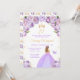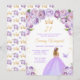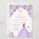 Cette invitation à la fête d'anniversaire élégante et glamour présente une belle princesse aux cheveux blonds dans une robe de bal violet clair. Le texte combine écriture manuscrite et polices sans serif modernes pour un look élégant et sophistiqué. Les arrangements floraux, papillons et confettis d'or créent un mélange parfait de rustique et de chic. Graphiques par www.etsy.com/uk/shop/SunflowerDayLove