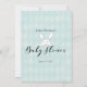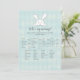 Un lapin blanc au-dessus du titre du jeu avec un fond bleu aqua bébé et à motif diamant. Modèles créés pour vous. Il s'agit d'un jeu 'qui est ma maman' pour baby shower.
