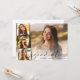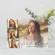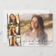 Élégant script photo superposition de la carte plat d'invitation de la fête de graduation avec la photo du diplômé sursuperposé avec une bande de trois petites photos carrés et "diplômé" dans un mince script moderne et leur nom et année de classe dans la simple typographie. Au verso, ajoutez les détails de la fête de remise de diplômes.