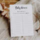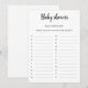 Ajoutez de l'excitation à votre célébration avec ce jeu de société de course de noms de bébé. Cette activité imprimable rapide demande aux invités de trouver des noms de bébé en fonction de différentes lettres ou catégories dans un délai imparti.