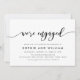 Élégante Invitation de la partie d'engagement avec les mots "Nous sommes engagés" dans un script de relaxation cursive en noir contre un arrière - plan blanc. La carte est recouverte d'un côté noir avec des lignes blanches qui se chevauchent. Personnalisez-le en remplaçant le texte de l'espace réservé. Pour plus d'options comme changer la police et sa taille/couleur ou l'espacement entre les lettres cliquez sur le bouton "Personnaliser". *Veuillez noter que le filigrane Zazzle qui apparaît dans l'aperçu du zoom n'apparaîtra PAS sur le produit imprimé final. © Bois de rose et agrumes