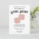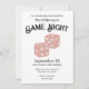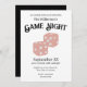 Ces invitations personnalisées pour des fêtes ont un thème de la nuit du jeu. Une image de jeu de dés est imprimée au centre dans une parties scintillant rose. L'expression "Game Night" est imprimée au-dessus des dés avec un exemple de nom de famille. Vous pouvez personnaliser les invitations de parties de jeu pour inclure votre propre nom ou texte personnalisé.