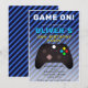 Invitation d'anniversaire de jeu vidéo avec manette de jeu sur un fond de bande lumineuse néon bleu vif.