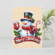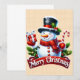Ce design de Noël présente un bonhomme de neige souriant, vêtu d’un haut-de-forme noir orné d’un flocon de neige et d’une branche de houx. Le bonhomme de neige porte une écharpe rouge à carreaux et tient dans sa main gauche un cadeau rouge avec un ruban blanc, tandis que sa main droite tient une canne en sucre d’orge rouge et blanche. À ses pieds se trouvent des baies rouges et des feuilles vertes, ajoutant une touche colorée au tableau. L’image est surmontée par une bannière rouge ondulée avec l’inscription “Merry Christmas” en lettres blanches stylisées, soulignées par deux branches de sapin. L’ensemble évoque la chaleur et la joie des festivités hivernales, rendant ce design parfait pour transmettre les vœux de saison.
