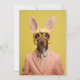 Un teckel élégant habillé pour Pâques avec un costume rose pastel, une cravate rayée et un casque à oreilles de lapin jaune, dégageant charme et fantaisie sur un fond jaune vif. Un parfait mélange d'élégance et d'humour pour une célébration festive de Pâques.