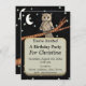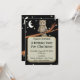 Cette invitation à la fête à carte plate est noire avec un joli hibou brun assis sur une branche d'arbre portant un collier bleu sous une lune blanche croissant et étoiles. Customisez vos informations dans la zone de texte en or avec les modèles.