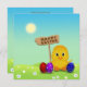 Illustration mignonne de Pâques représentant un petit poussin tenant un panneau en bois avec un message de Joyeuses Pâques, assis dans un champ de fleurs à côté d'œufs de Pâques colorés.