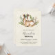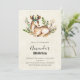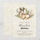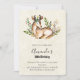 Invitation d'anniversaire avec un joli cerf couché entouré de flore feuillue.