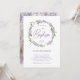 Cette belle invitation Baptême branchée présente une jolie couronne d'aquarelle aux élégantes fleurs lilas violettes vintages, avec beaucoup d'aquarelle feuillage et feuilles botaniques verts. Il y a aussi une fausse croix d'or et un script moderne violet. Au fond de l'invitation se trouve un joli cadre floral lilas, et la photo de votre bébé au centre.