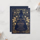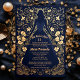 Cette invitation de quinceañera exquise présente une silhouette époustouflante d'une jeune femme parée d'une belle robe, capturant l'essence de la célébration de l'entrée dans l'âge adulte. L'image prend vie sur un fond bleu foncé et sombre, ajoutant une touche d'élégance et de sophistication. S'entremêlant avec la silhouette, des motifs floraux complexes rendus dans une teinte dorée saisissante donnent au design une touche royale. Le mélange des tons dorés et bleus foncés crée une esthétique à la fois saisissante et agréable à l'œil. Chaque détail du design met magnifiquement en place la célébration mémorable de quinceañera à venir.