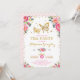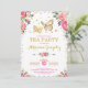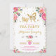 Invitation à une fête du thé sur le thème papillon féminin avec une superbe illustration de fleurs rose pâle et rose chaud à l'aquarelle et une paire de papillons dorés complexes