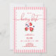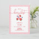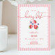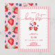 Faire-part de première année pour bébé fille rouge "Cute Red Baby Girl Berry" qui présente des fraises et des myrtilles aquarelles ludiques sur un fond rayé rose avec une calligraphie rouge moderne et un cadre blanc festonné. Un choix mignon et coloré pour le premier anniversaire d'une petite fille, inspiré par un thème de fruits d'été ou une ambiance de marché fermier. Parfait pour célébrer votre petit bout qui devient grand !
