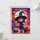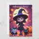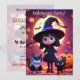 Cette invitation présente une jolie petite sorcière en costume noir avec des chats et des citrouilles la nuit d'Halloween.