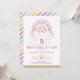 Invitation d'anniversaire pour les filles avec arc-en-ciel dessiné à la main, nuages colorés et étoiles brillantes.