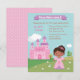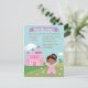 Organisez une fête d'anniversaire de conte de fées pour la fille d'anniversaire afro-américaine avec cette invitation de fête d'anniversaire de thème princesse. Cette invitation a une mignonne princesse afro-américaine qui porte une robe rose et violette attachée avec un ruban rose et une tiare rose sur ses cheveux attachés. Un oiseau bleu et jaune est près de ses pieds. Arrière - plan d'une belle pelouse, certains avec des fleurs, certains avec des arbres et un château rose avec toit violet. Personnalisez facilement avec les détails de votre fête, y compris la bannière violette. Page inverse du motif pois rose.