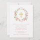 Cette belle invitation au baptême ou au baptême présente une couronne de roses d'aquarelle rose avec des feuilles verts et des accents d'or faux rose, et une fausse croix d'or au centre. Le dos de la carte est d'une couleur rose douce avec des bouquets floraux assortis dans les coins.