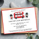 Invitation à la fête d'anniversaire à thème de Londres avec un bus rouge à deux étages, garde de palais et policier. Back a un arrière - plan rouge et a du texte et de l'âge personnalisables.