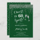 Invitation du 60e anniversaire. Salutations À 60 Ans ! Design élégant en vert, blanc et argent. Il comprend des verres à champagne, des caractères de script et des confettis en argent parties scintillant. Idéal pour une soirée de soixantième anniversaire. Personnalisez avec vos propres détails. Peut être customisé pour montrer n'importe quel âge.