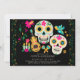 Invitation à la fête d'anniversaire du Jour des Morts avec des crânes à sucre fleuris, art folklorique mexicain et des bougies. L'occasion est indiquée dans une typographie décalée et le modèle est prêt à vous customiser avec vos détails. L'arrière de l'invitation a du lièvre et des guirlandes de fleurs. Consultez ma collection Dia de los Muertos pour trouver d'autres styles et articles correspondants.