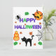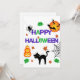 Cette invitation présente les mots "Joyeux Halloween" dans une police d'impression de style effrayant avec des lettres violettes et vertes entourées d'une collection d'autocollants sur le thème d'Halloween dans ce thème et style effrayants. Imprimé sur un papier classique de 17,5 pt d'épaisseur avec une finition mate non couchée avec une texture de coquille d'œuf fabriqué et imprimé aux États-Unis avec "Trick Or Treat" imprimé au verso.