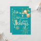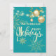 Joyeuses fêtes flocons de neige dorés et ornements de Noël, flocons de neige, guirlandes lumineuses, carte d'invitation verte élégante et moderne pour les fêtes.
