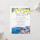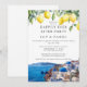 Cette élégante invitation de mariage pour une fête de joyeux à jamais, avec des citrons aquarelle et une scène de Santorin, Grèce peut être personnalisée avec vos informations dans une typographie chic. Conçu par Thisisnotme©