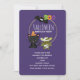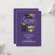 Une invitation d'anniversaire pour Halloween avec une chauve-souris noire volante, une chauve-souris momie verte portant des bandages blancs et un chat noir mignon avec un chapeau de sorcière orange. Boo écrit en lettres colorées amusantes. Fond violet foncé.