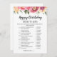 Achetez ce jeu éditable et profitez de la carte Happy Birthday de haute qualité autour du monde pour votre événement! C'est un modèle de jeu, Vous pouvez changer les questions comme vous le souhaitez! Design de fleurs.