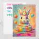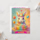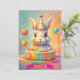 Un petit lapin joueur est assis fièrement avec un gâteau d'anniversaire vibrant. Le lapin est entouré de teintes pastel douces, de décorations fantaisistes et de ballons, créant une atmosphère joyeuse et festive parfaite pour un jour spécial.