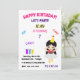 Invitation d'anniversaire de fille avec nom et âge personnalisés célébrant plaisir, jeux, gâteau et glace.