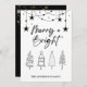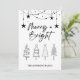 Joyeux Bright Élégant Script Pine Arbres Noël Foil personnalisé Carte de vacances | Cartes de Noël uniques personnalisées | Black and White Modern Snowflakes X-mas Cartes de fin de année | Il comprend le texte de calligraphie de script brossé 'Merry + Bright' et des doodles de pin.