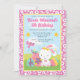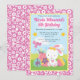 Célébrez un joyeux anniversaire avec cette invitation festive sur le thème de Pâques, mettant en vedette un lapin blanc avec un nœud jaune entouré d'œufs décorés, de fleurs printanières et d'un oiseau rose. Un champ herbeux et un ciel bleu avec des étoiles plantent la scène ludique, encadrée par une bordure rose avec des accents floraux blancs. Parfait pour les anniversaires de Pâques, les fêtes saisonnières ou la papeterie de célébration personnalisée.