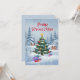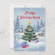 Carte de Noël avec un sapin décoré festivement dans une forêt enneigée. Autour de l'arbre se rassemblent des animaux mignons, entourés de cadeaux et de lumières scintillantes. Le design féerique et affectueux convient parfaitement aux enfants et aux adultes.