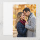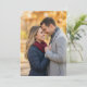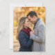 This wedding invitation features a heartwarming photograph of two individuals standing closely together, smiling against a backdrop of blurred autumn foliage in warm hues. The design showcases a realistic representation style with an earthy color palette including deep navy blue, rich burgundy, and light gray, creating a cozy and intimate atmosphere. The layout is centered, emphasizing the affectionate connection between the subjects, making it perfect for capturing the joy and warmth of your special day.