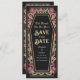 Faites une déclaration audacieuse d'amour éternel. Ce mariage gothique Save-The-Date présente "Till Death Do Us Part" dans un cadre en forme de cercueil, orné d'épines, de roses et d'accents d'or rose contre un arrière - plan noir. Parfait pour une fête romantique ! Personnalisez le texte, la police et la couleur arrière - plan en fonction de vos préférences de conception. Objets correspondants dans notre boutique pour un thème de fête complet. Veuillez noter que l'or rose sur les cartes n'est PAS du papier à papier et est imprimé en couleurs plates.