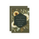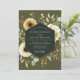 Embrace a mood of rustic elegance with this sophisticated botanical design, set against a deep khaki green backdrop. Lush, creamy white chrysanthemums and pale golden blooms are artistically arranged with muted eucalyptus and sage greenery. This earthy and romantic composition is perfect for a stylish autumn or vintage-themed affair.