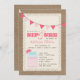 Une invitation à la gorgée et à la vue avec du bunting rose en haut et une illustration d'un pot de mason de limonade rose en bas à gauche. Le Arrière - plan à l'avant et à l'arrière est inspiré des burlap. Le design de l'avant est inspiré de la dentelle. Personnalisez le texte avec vos informations.