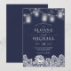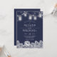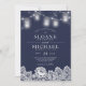Ce faire-part de mariage élégant et rustique comporte une frontière sensible de dentelle le long du fond avec les pots de maçon et les lumières rougeoyants de ficelle. Montré ici avec un arrière - plan de bleu marine. Choisissez n'importe quelle couleur d'arrière - plan pour assortir votre thème de mariage.