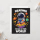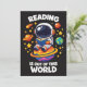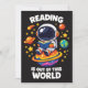 La lecture est hors de ce monde montre un astronaute mignon assis sur une planète lumineuse en train de lire un livre dans l'espace. Une scène de lecture ludique sur le thème de l'espace pour les amoureux des livres, les étudiants et les amateurs de science qui aiment l'imagination et la curiosité.