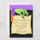 Commencez votre fête d'Halloween avec cette invitation de sorcière éffrayante et amusante avec la main d'une sorcière verte avec de longs ongles noirs tenant un morceau de papier avec le texte de votre fête.