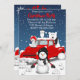 This design feobjets the nostalgia of a vintage red truck with some Arctic animals and a snowman in a wintry scene.