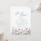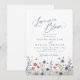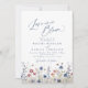 Aquarelle florale champ de fleurs sauvages avec un script moderne "l'amour est en fleurs" en bleu marine et rouge bordeaux, élégant et sophistiqué, grande invitation pour un mariage rustique d'automne, shower de couple de jardin classique, et fête d'engagement bohème d'hiver.