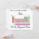 Si vous organisez une réception de mariage geek ou une réception de mariage pour un chimiste ou un scientifique, vous profiterez de ces élégantes invitations personnalisables avec le Tableau Périodique des Éléments et le truisme scientifique disant "L'amour est un élément". Invitations mémorables pour tous ceux qui connaissent la Table Périodique des Éléments. Entièrement personnalisable pour répondre à vos besoins de réception de mariage ou de fête !