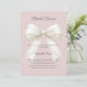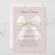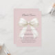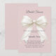 Organisez une célébration sophistiquée avec cette invitation de mariage rose saumon poussiéreux romantique. Le design présente un grand nœud illustratif ivoire orné de délicats brins de perles sur un fond rose doux. Cette invitation élégante est parfaite pour la mariée féminine qui aime les accents de coquette classiques et les détails élégants. Personnalisez et ajoutez un nom et les détails de la fête.
