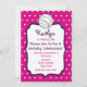 Invitation de fête d'anniversaire d'une fille comportant un arrière - plan rose avec le pois blanc sur l'avant et le dos. L'avant comporte le cadre pourpre lumineux avec l'écriture pourpre et rose. Illustration de volleyball en haut.