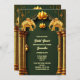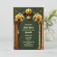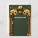 De belles fleurs dorées de lotus apparaissent au milieu le long du bord supérieur et sont flanquées de deux éléphants indiens en faux or. Les éléphants se tiennent sur des colonnes dorées opulentes qui ont deux petites lanternes sur elles et sont encadrés de délicats petits fleuris et d'une arche dressée contre un arrière - plan vert de forêt. Les modèles de texte personnalisés blancs pour votre libellé personnalisé apparaissent ci-dessous. Les tons chauds, riches, bleu, or, bordeaux et blanc confèrent à l'ensemble une atmosphère luxueuse et haut de gamme. Le dos a le même design et des modèles supplémentaires pour des informations supplémentaires que vous pouvez vouloir fournir à vos invités et votre famille. Si ce modèle n'est pas nécessaire, il suffit de supprimer le libellé. Ce design élégant, royal et royal est idéal pour toute douche nuptiale hindoue ou hindi traditionnelle, ou pour une fête ethnique asiatique.