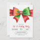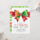 Large red and green bow Christmas holiday party Invitation. This festive Christmas holiday party invitation is adorned with a prominent, impressive red and green bow, featuring a delicate snowflake at its center. The reverse includes a playful pattern of varying red and green stripes, interspersed with charming snowflakes.